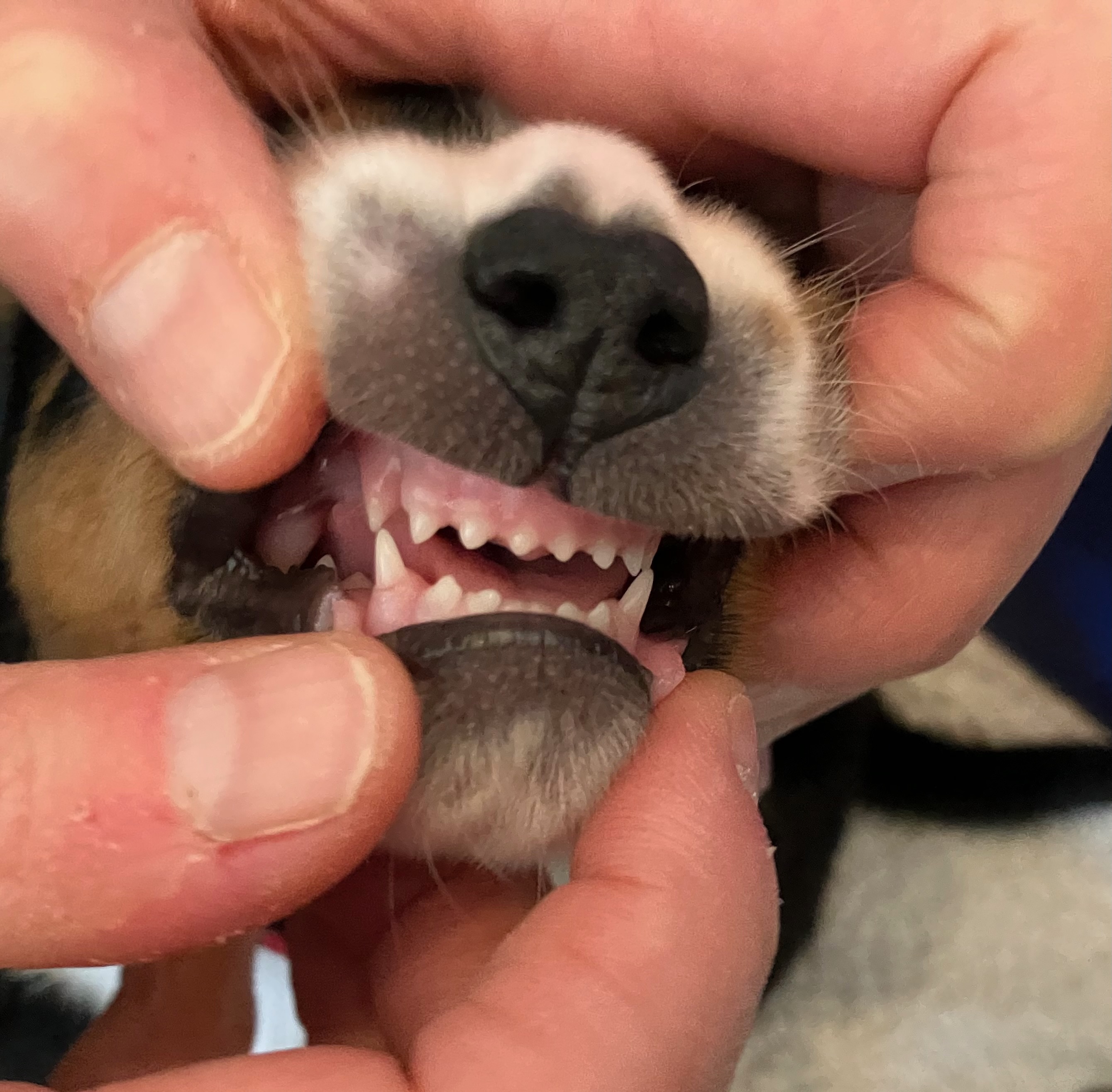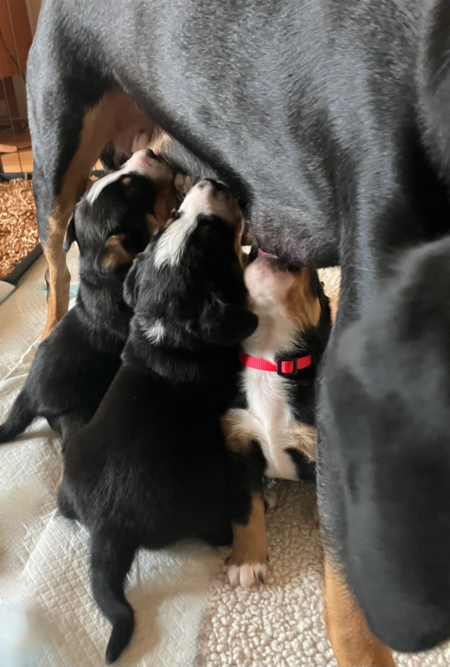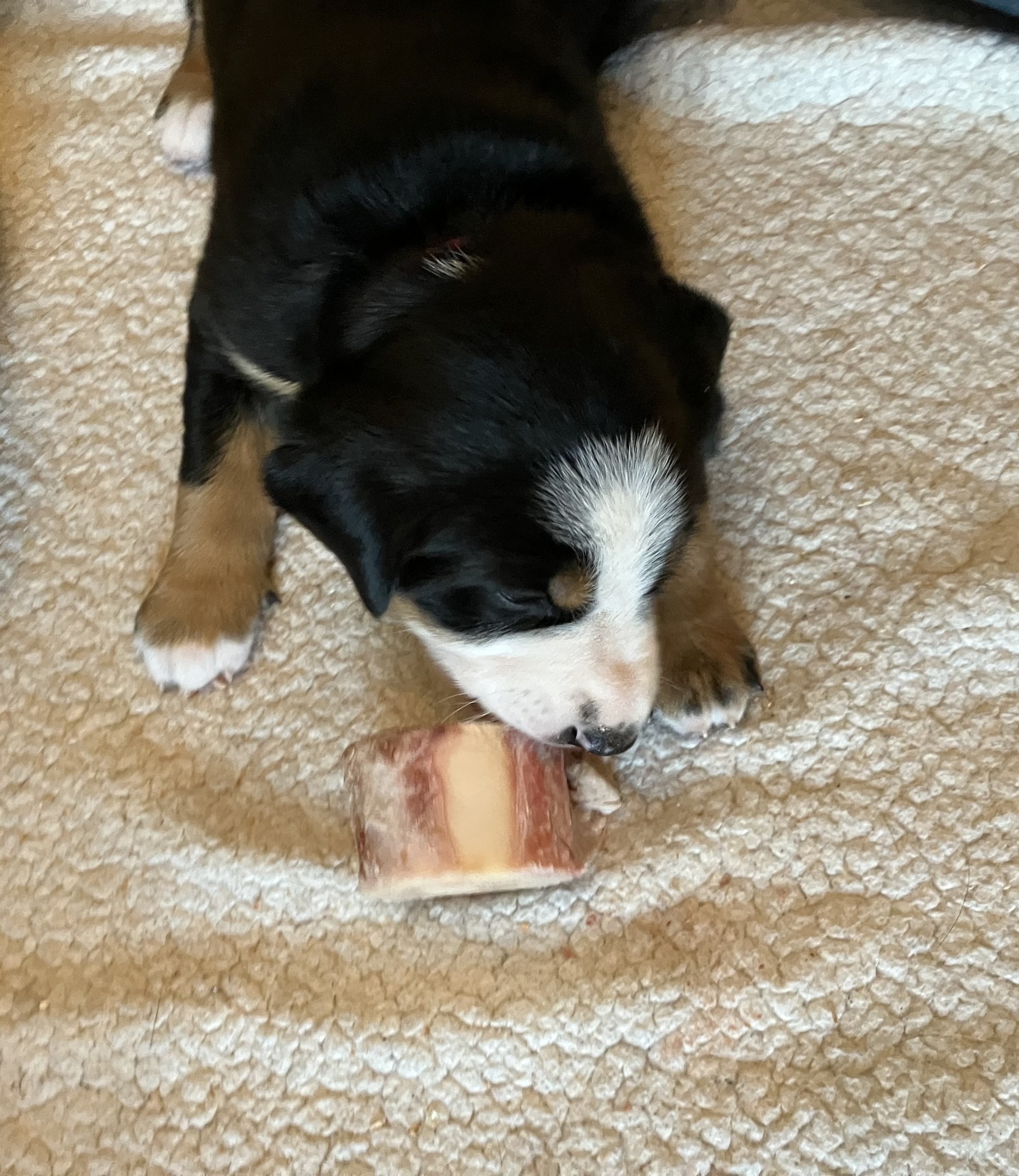 The pups’ weights are steadily increasing. To support all that growing, we have officially started the weaning process. The pups are now enjoying their first tastes of solid food, and while it took some experimenting with flavours and textures, they are now loving their new menu options! In addition to their soft diet, we also introduced marrow bones to the group this week to build jaw strength, and all five pups enjoy gnawing on them.